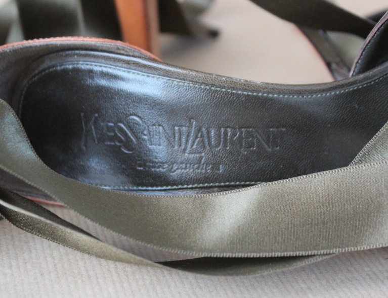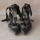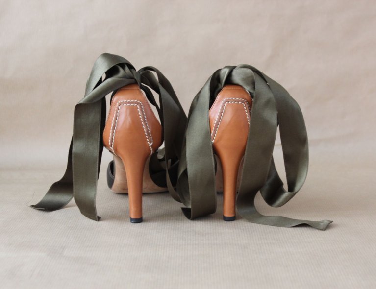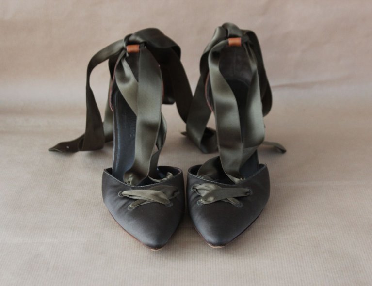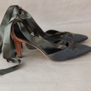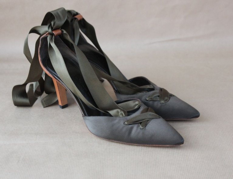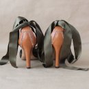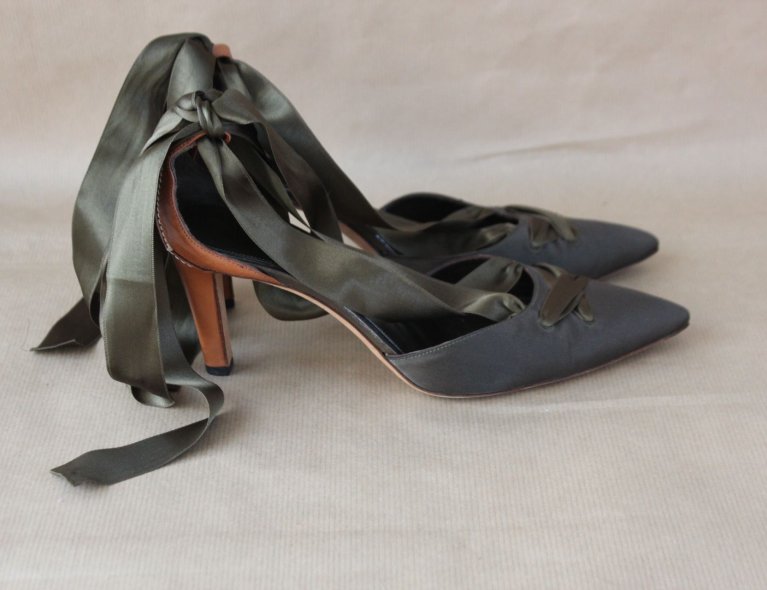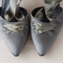 Olivfarbene Satinpumps mit Lederabsatz und Satinschleife zum Binden, Gr 38, benutzt, aber in gutem Zustand. Absatz 7,5 cm.