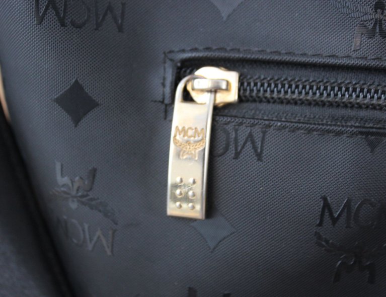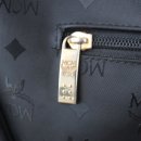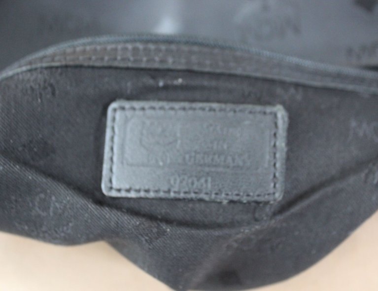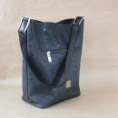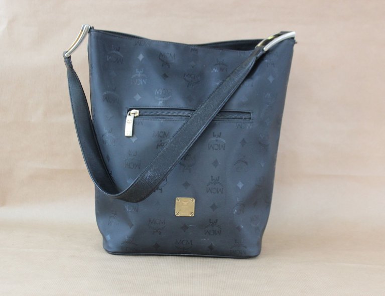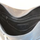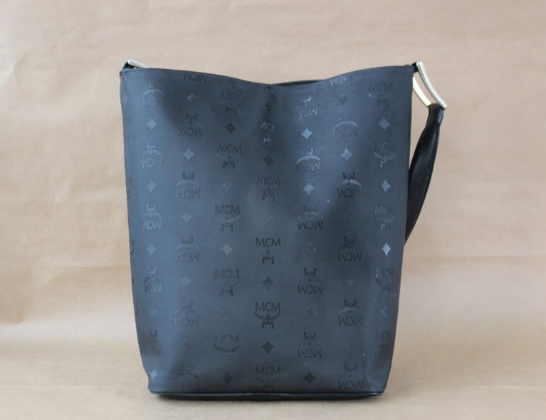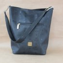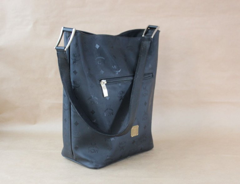 Schwarzer Nylon-Shopper mit Ledergriff, mit Drucker zu Schließen, ein Zipper-Innenfach, ein Zipper-Außenfach, Stoffutter. Altersgemäße Gebrauchsspuren, aber in gutem Zustand. Boden 23x13cm, Höhe 31cm.