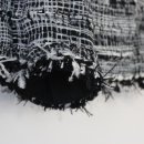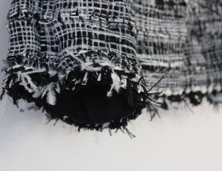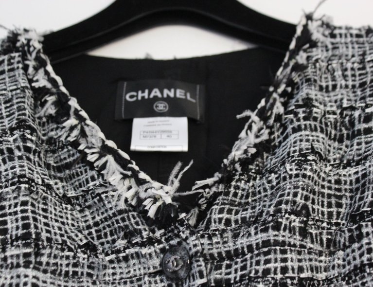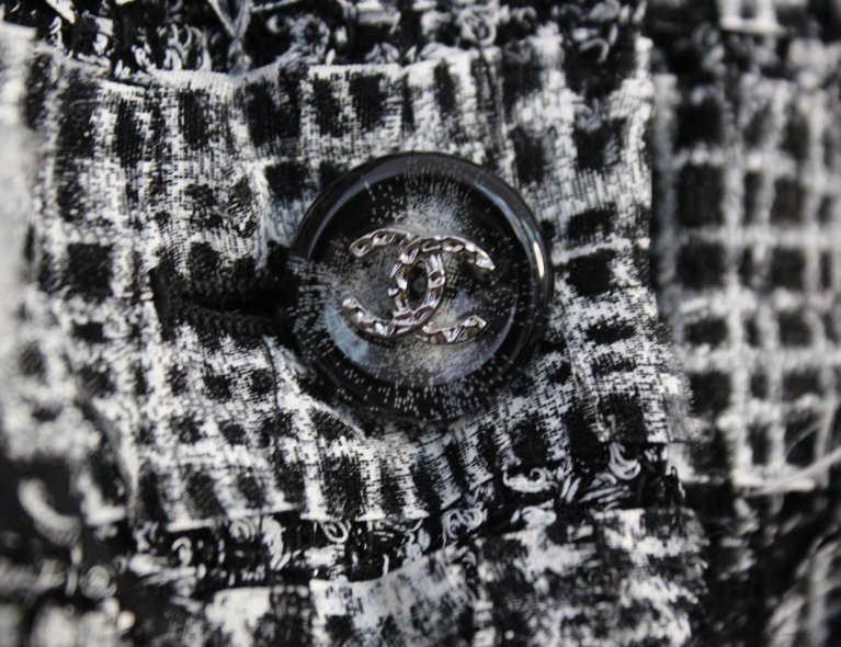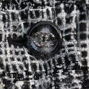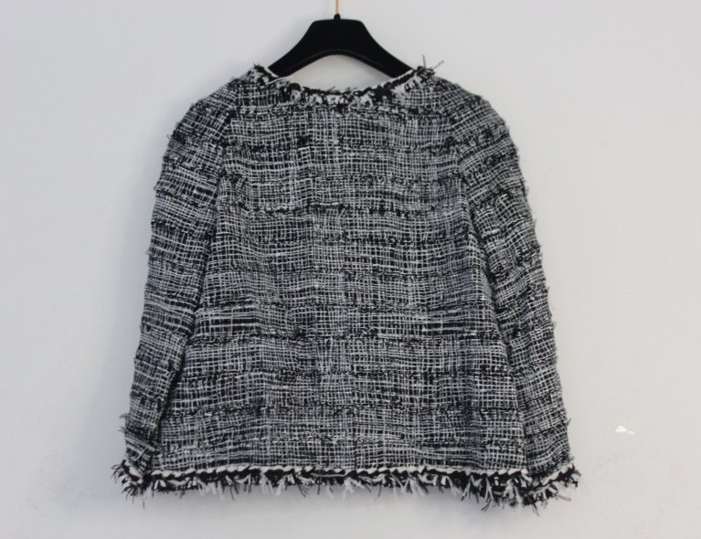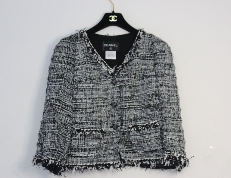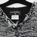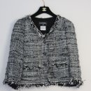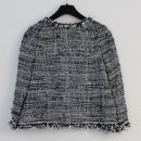 Schwarz/weiß melierte ¾-Ärmel-Jacke aus raffiniert aufgeschnittenem Doubleface-Bouclé, Gr frz. 40. Bestzustand.