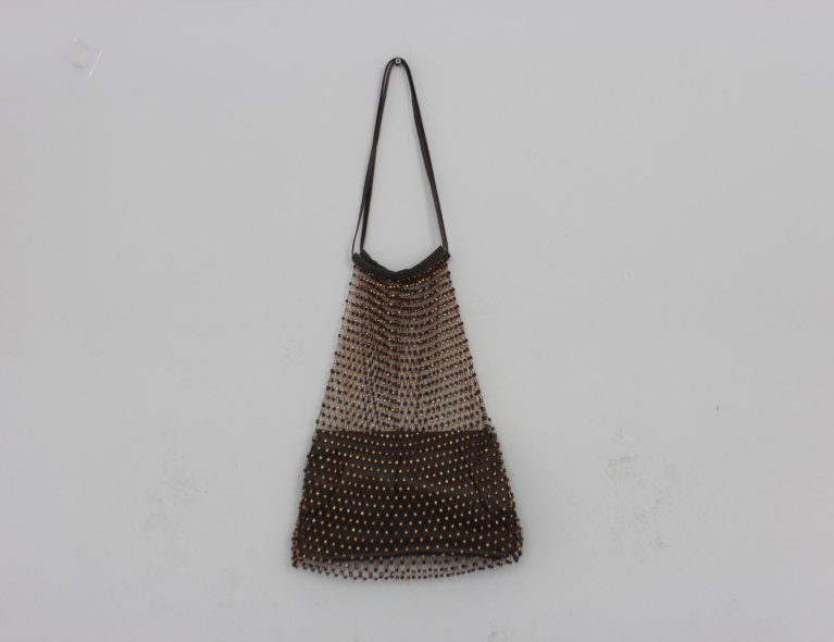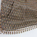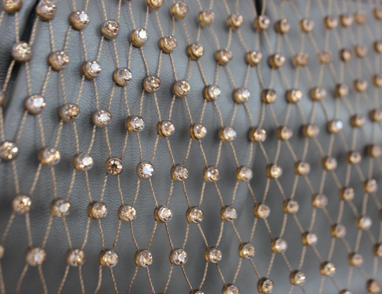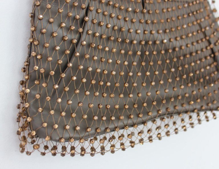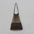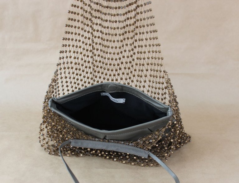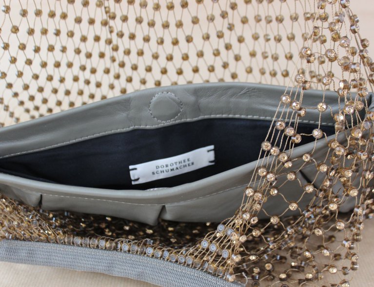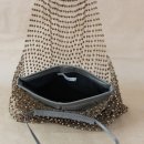 Ausgefallene Netztasche mit Straßsteinen und eingearbeiteter Lederclutch innen.