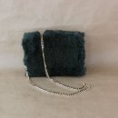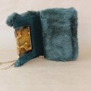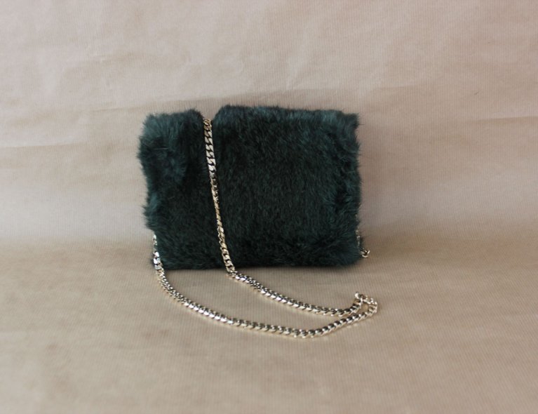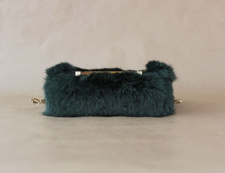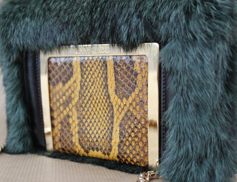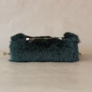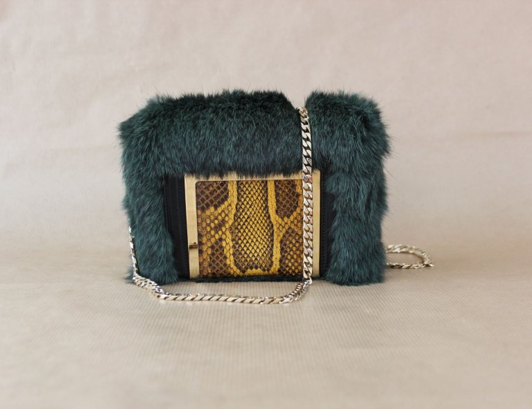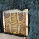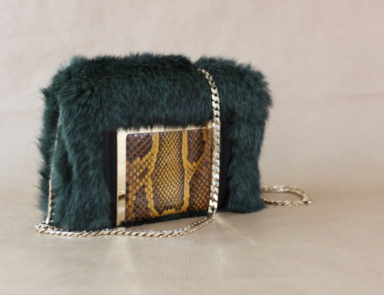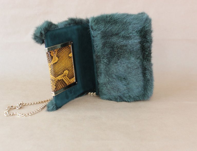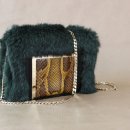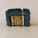 Dunkelgrüne Felltasche mit Schlangenleder-Intarsie. 16x12x5cm