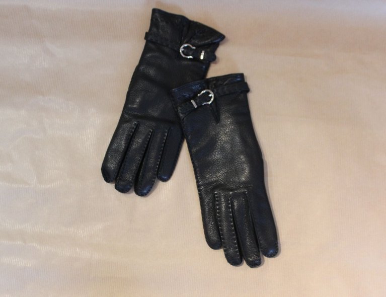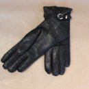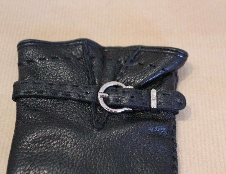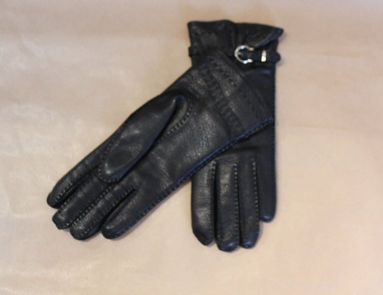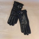 Schwarze genarbte Lederhandschuhe mit 100% Kaschmir-Strickfutter mit silberfarbener Schnalle am Riemchen. size S, top condition!