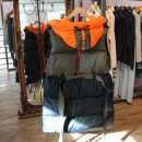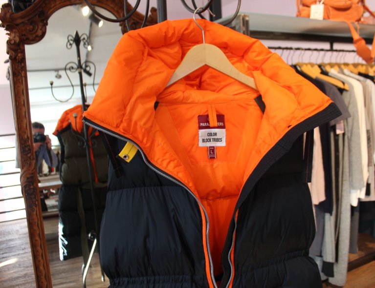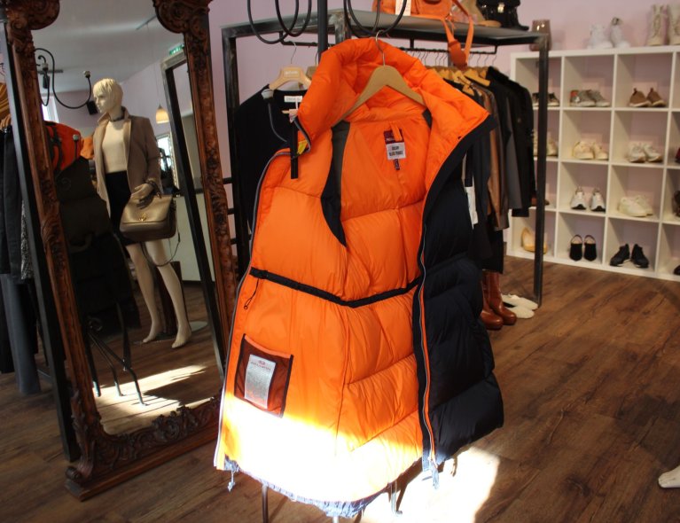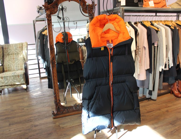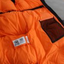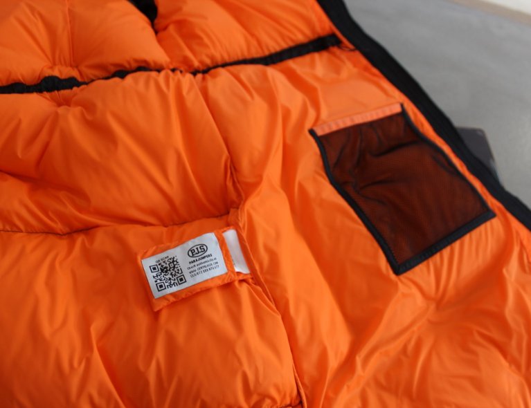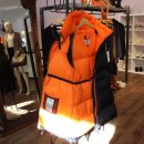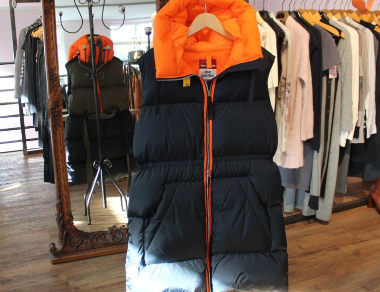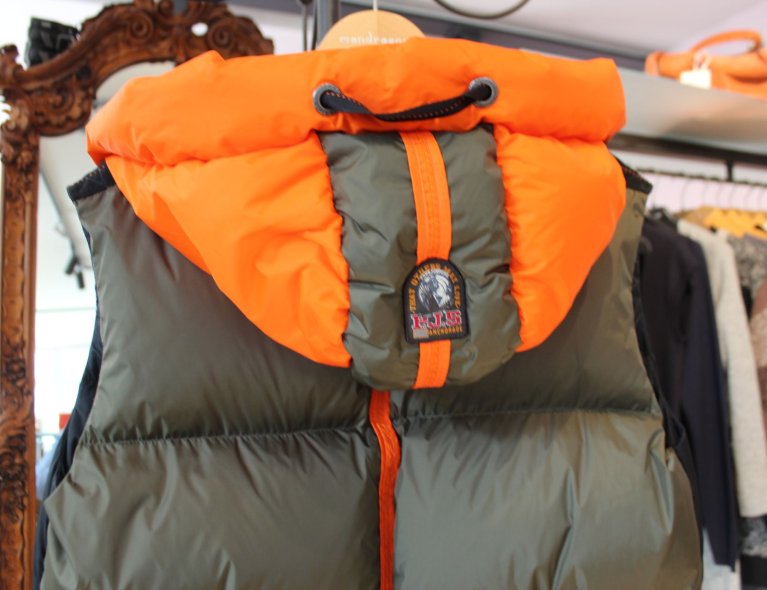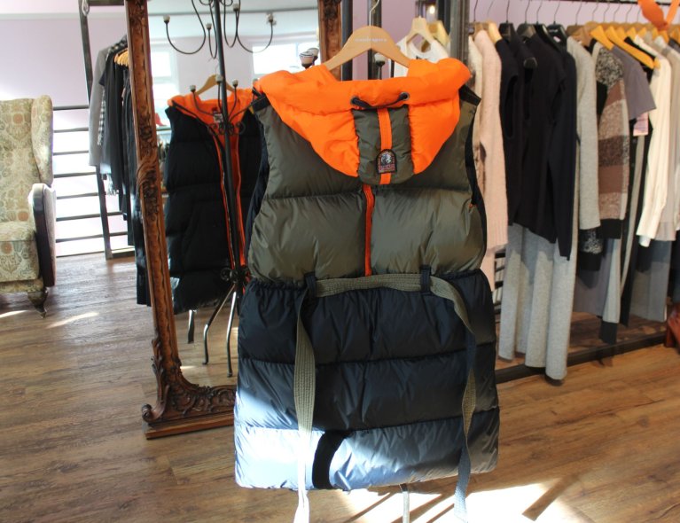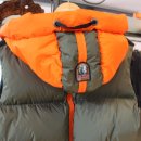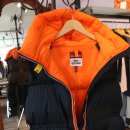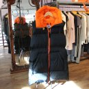 Dicke lange Daunenweste in schwarz/oliv/orange mit Kapuze und 2-Wege-Zipper. Gr L