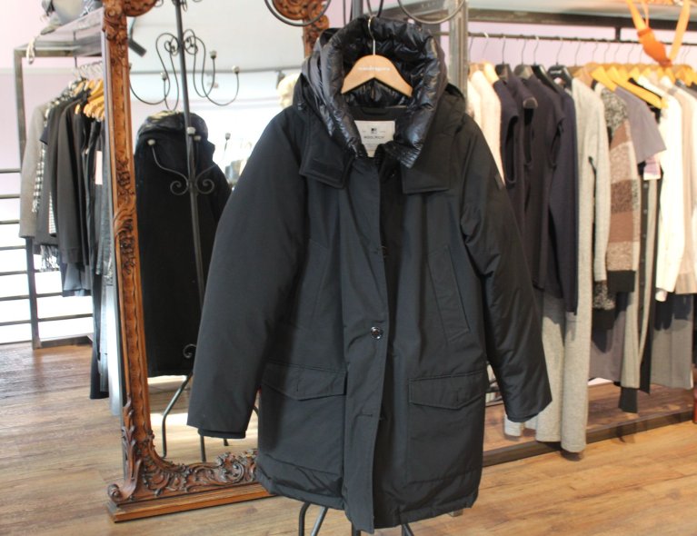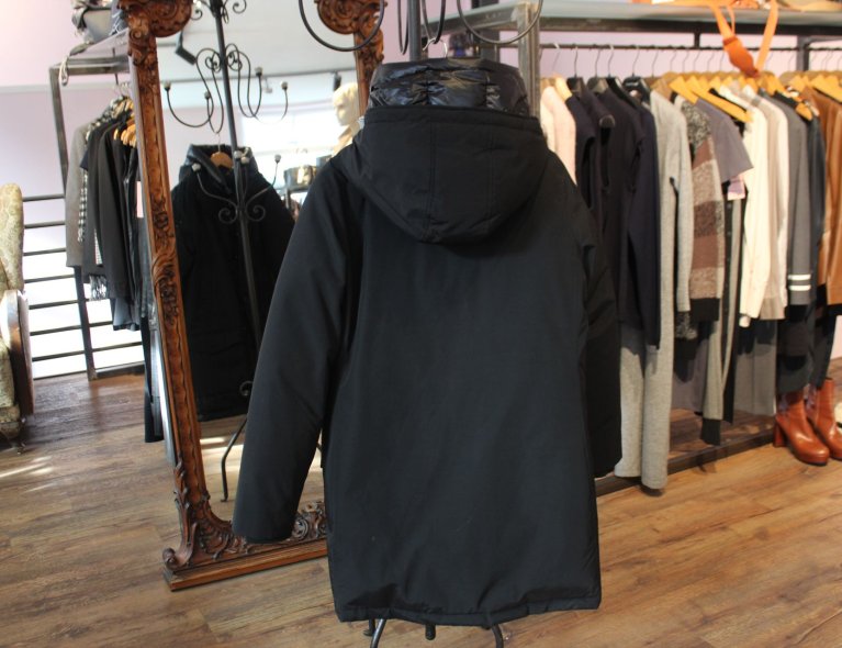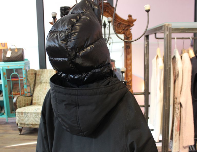 Dicker schwarzer Daunenparka aus teflonbeschichtetem “Ramar cloth”, wasserabweisend, windundurchlässig, atmungsaktiv, Gr XL. NEU!